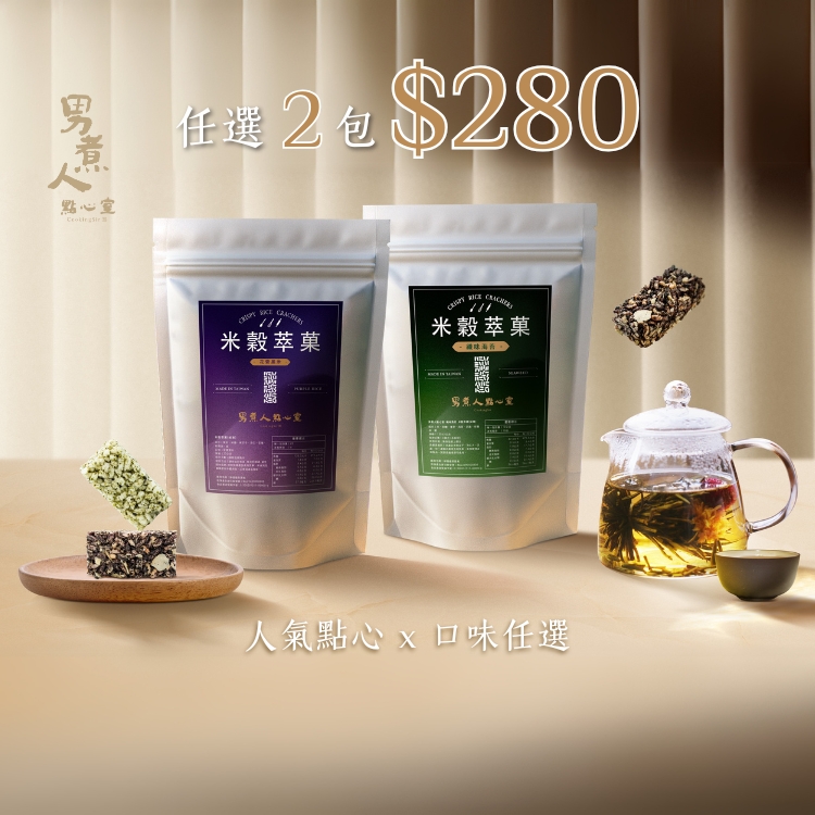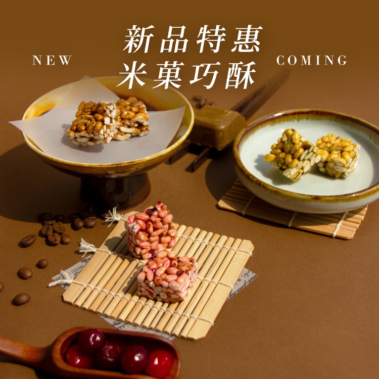 慶祝男煮人點心室三週年,全新「米菓巧酥」系列同步上市!以台灣糙米為底,結合手作工藝與三款獨家風味——咖啡、野莓、咖喱,打造外酥內鬆的幸福滋味。