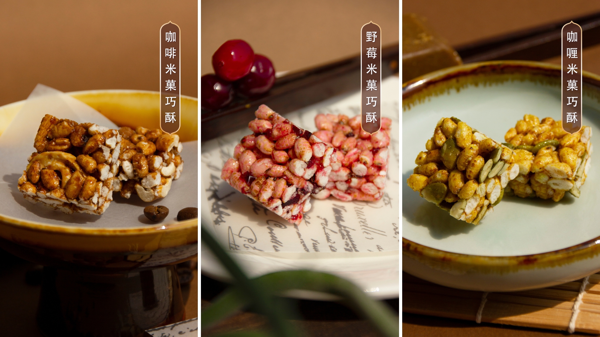米菓巧酥系列以米香為底,融合咖啡、野莓、咖喱三款靈感,