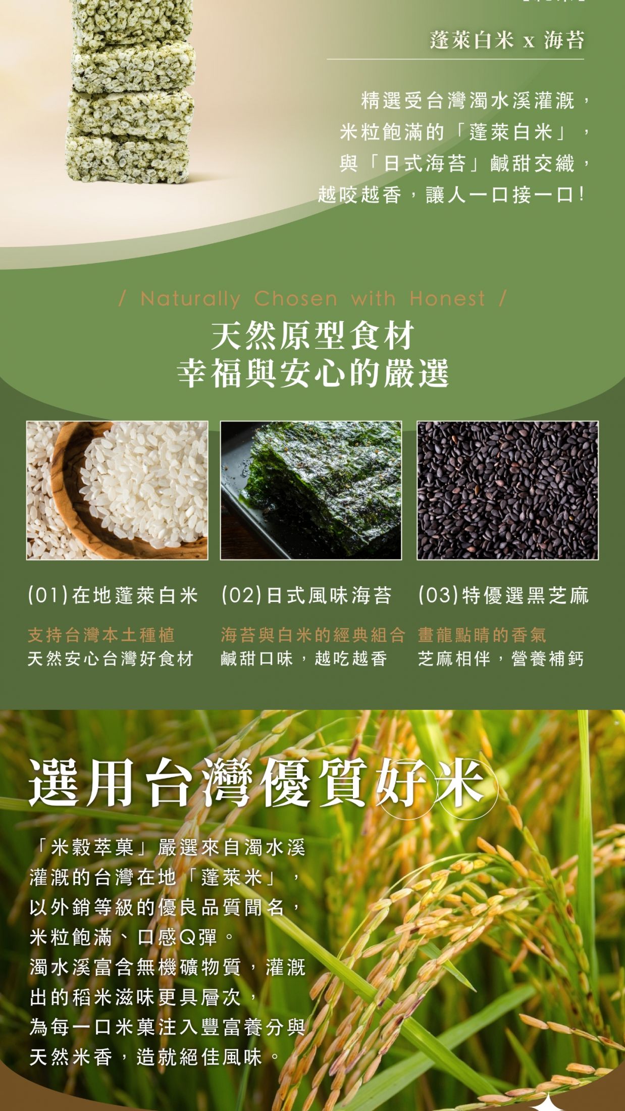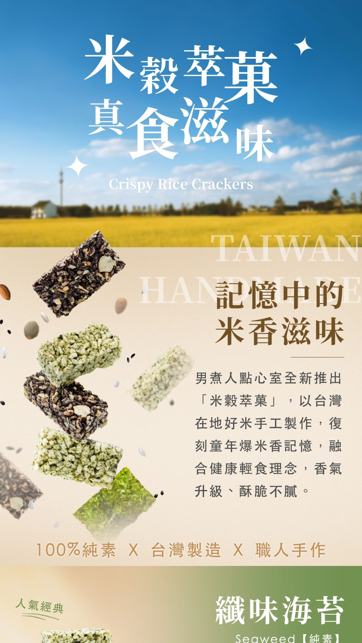 以台灣備受讚揚的蓬萊白米為基底,融合海味膳纖海苔與頂規黑芝麻,香脆過癮、清爽鹹香、營養可口,最適合家庭共饗、辦公解饞、旅行補給,午茶時間搭配飲品,就是最愜意的紓壓時光。純淨無負擔・不粘牙配方,職人純手工,搭配精緻袋裝設計,單入獨立包裝好衛生,精巧便攜,送禮自用兩相宜,台灣嚴謹製造,無添加防腐劑,安心又美味,一吃就愛上!