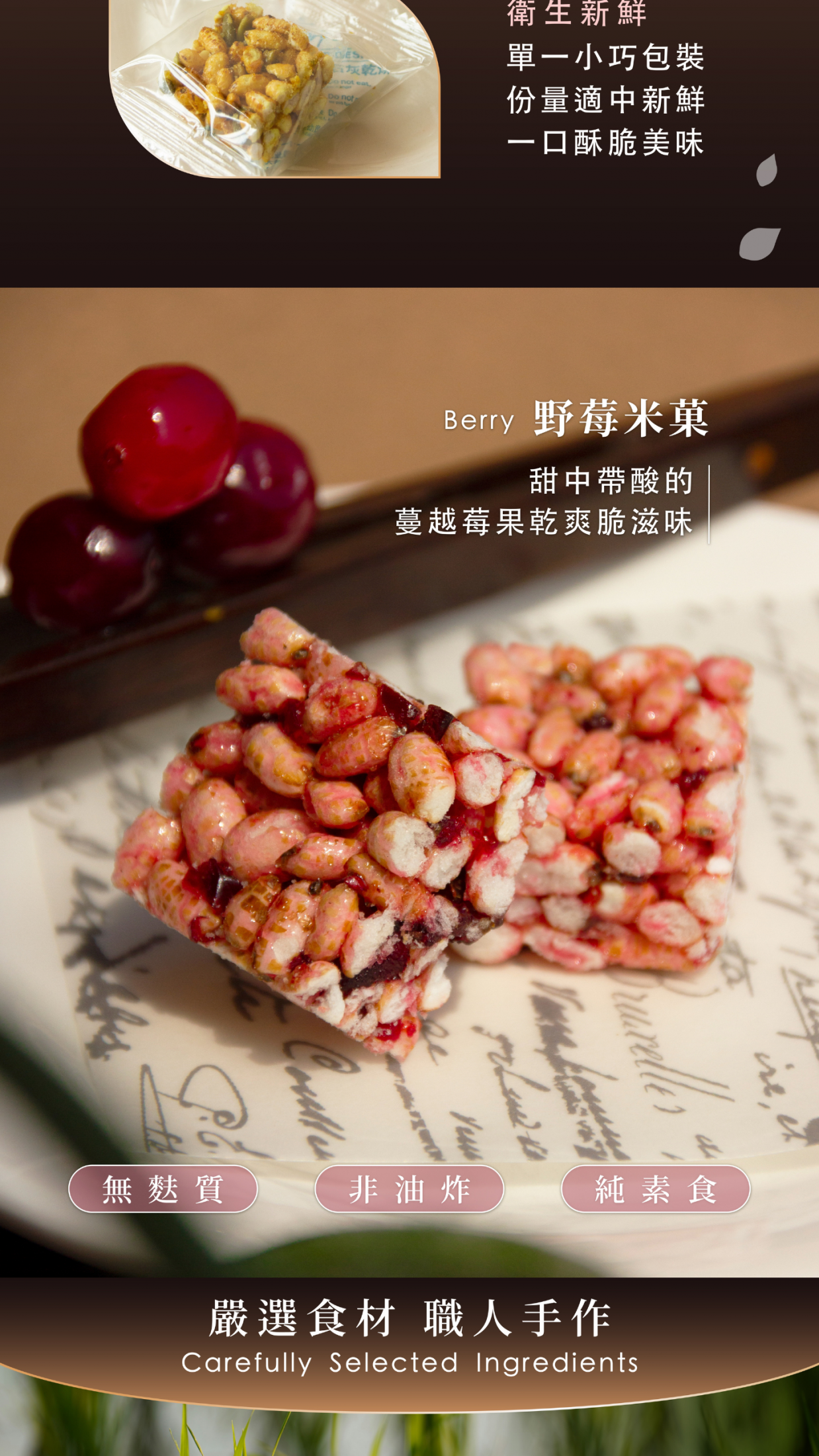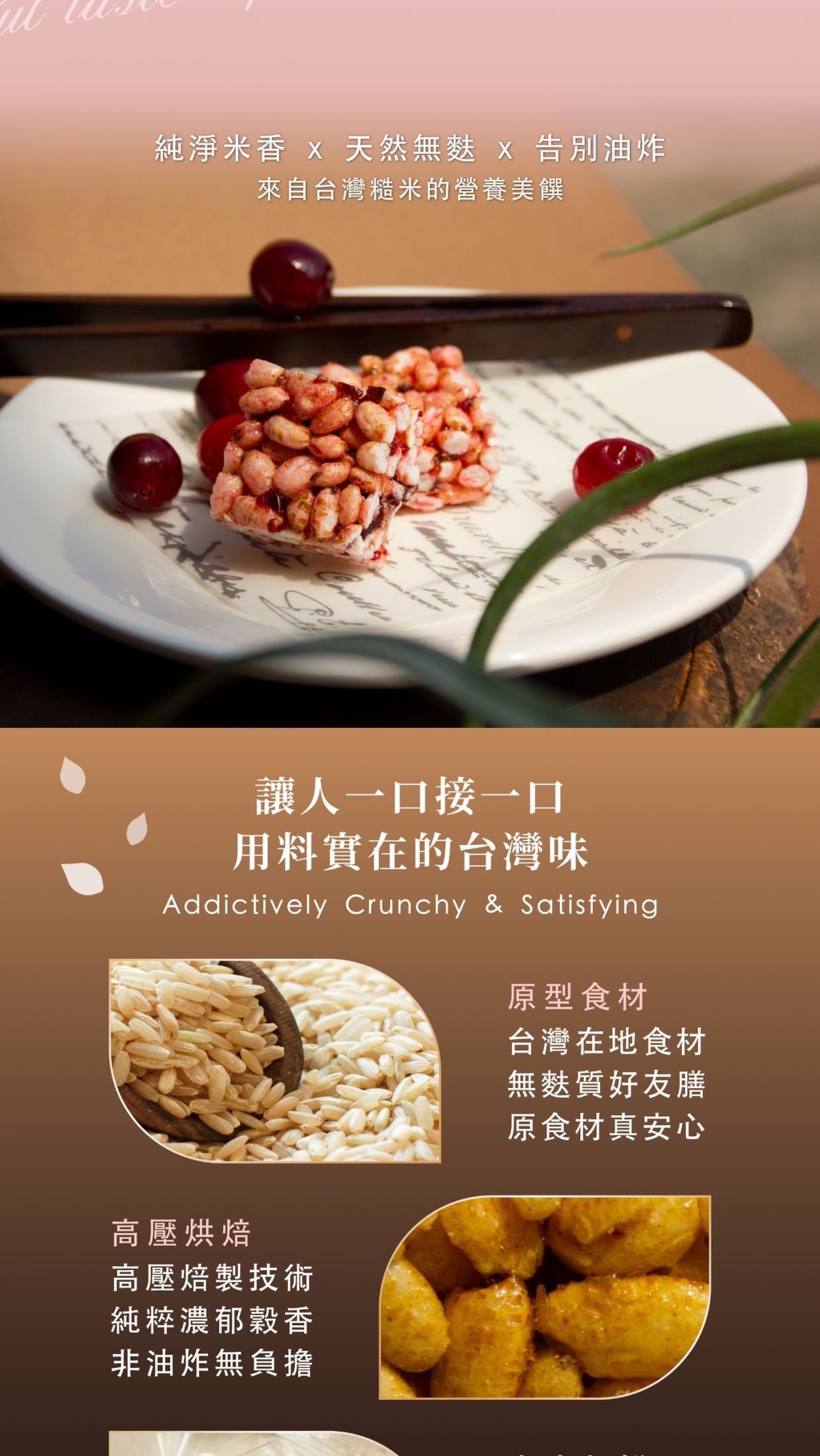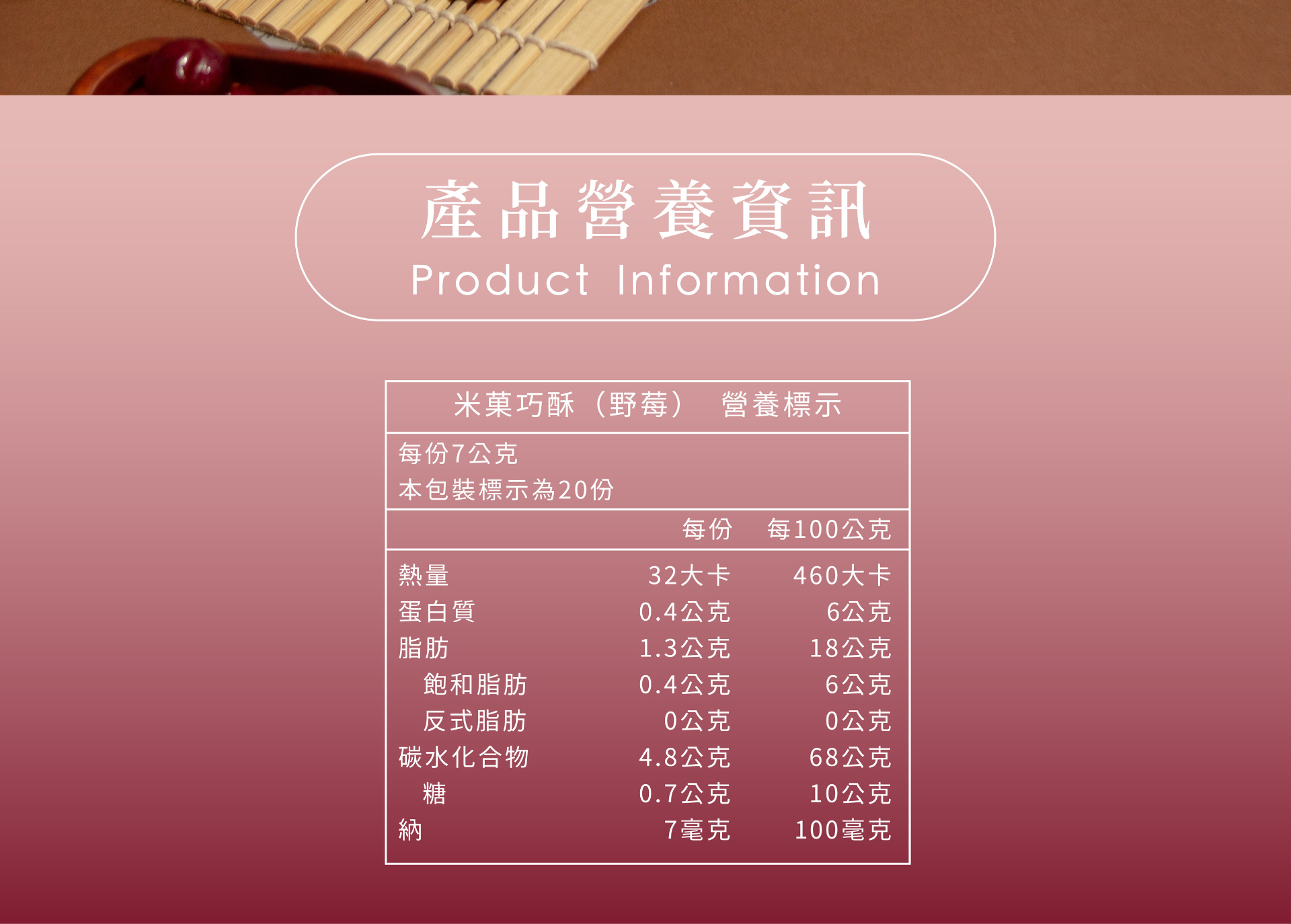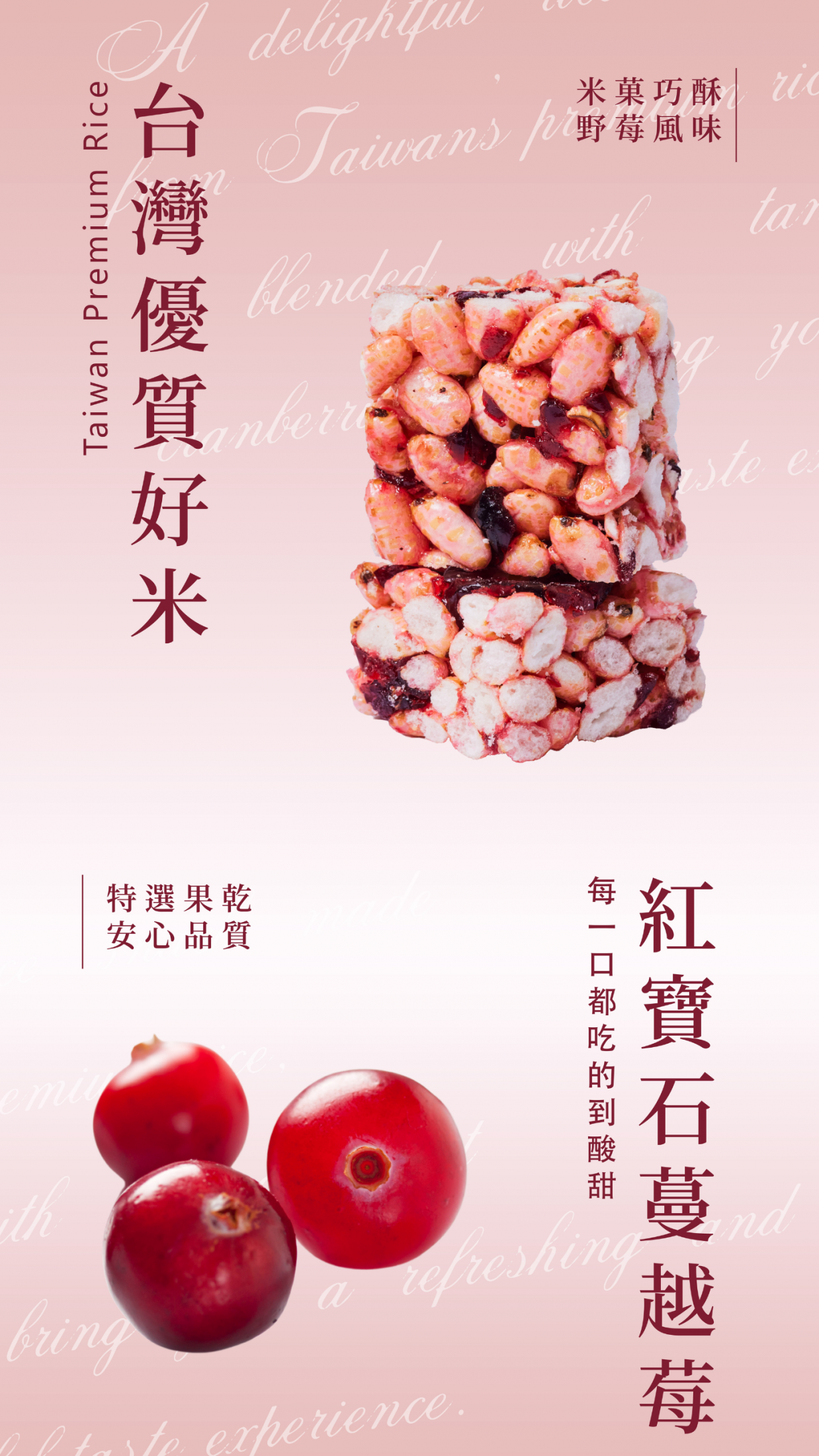 成分:糙米、麥芽糖(樹薯澱粉、水)、蔓越莓果乾(蔓越莓、蔗糖、葵花油)、草莓調味粉(糖、葡萄糖漿、完全氫化棕櫚油、鹽、麥芽糊精、二氧化矽、檸檬酸鉀、食用紅色六號、香料、脂肪酸甘油脂)、芥花油、水