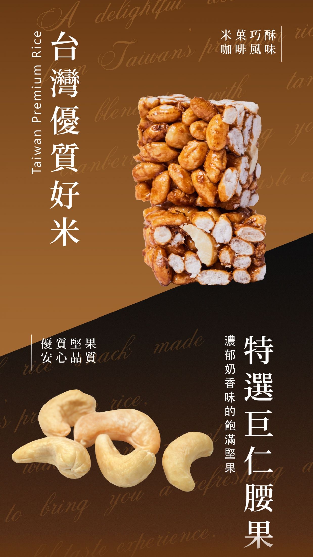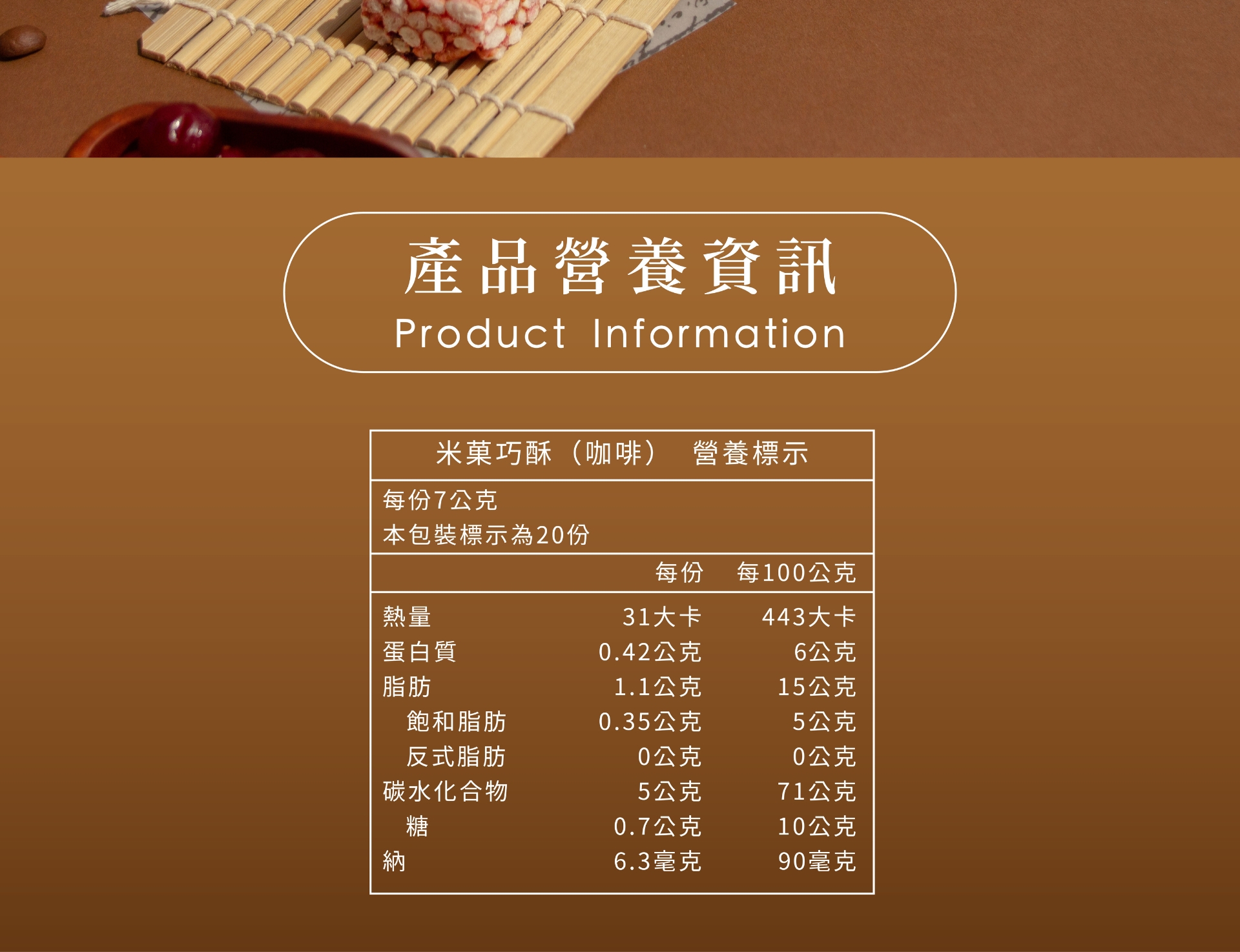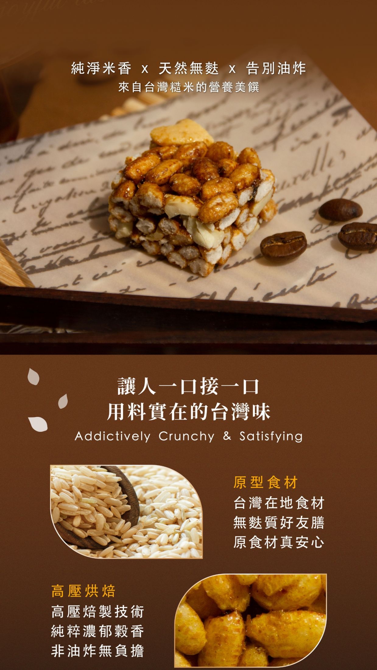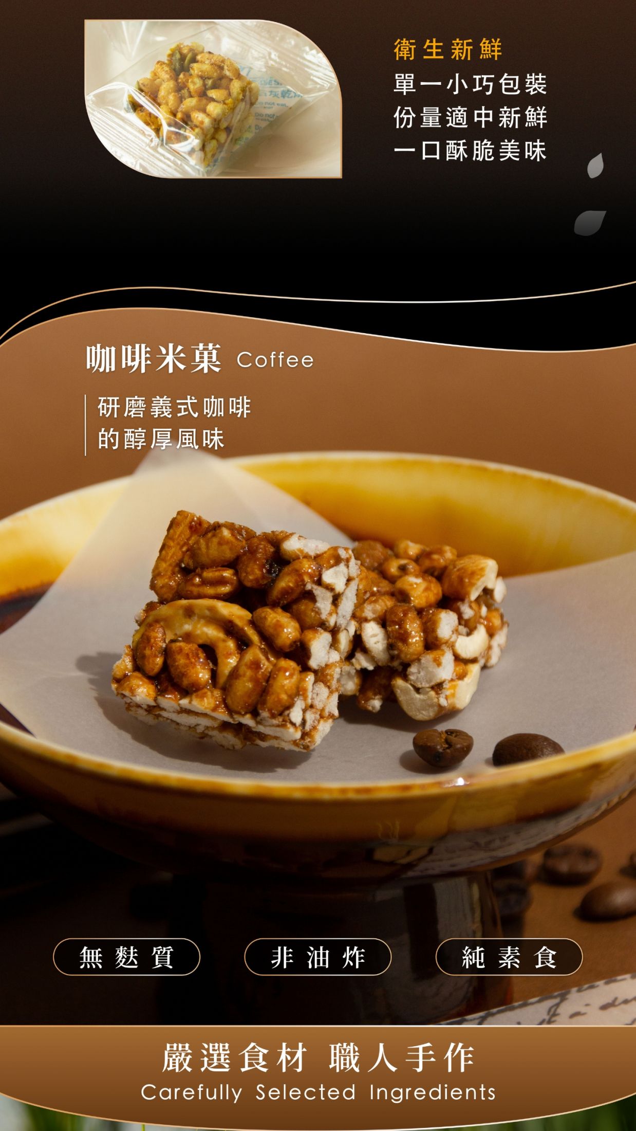 成分:糙米、麥芽糖、腰果、芥花油、糖、咖啡粉、鹽、二氧化矽、香料