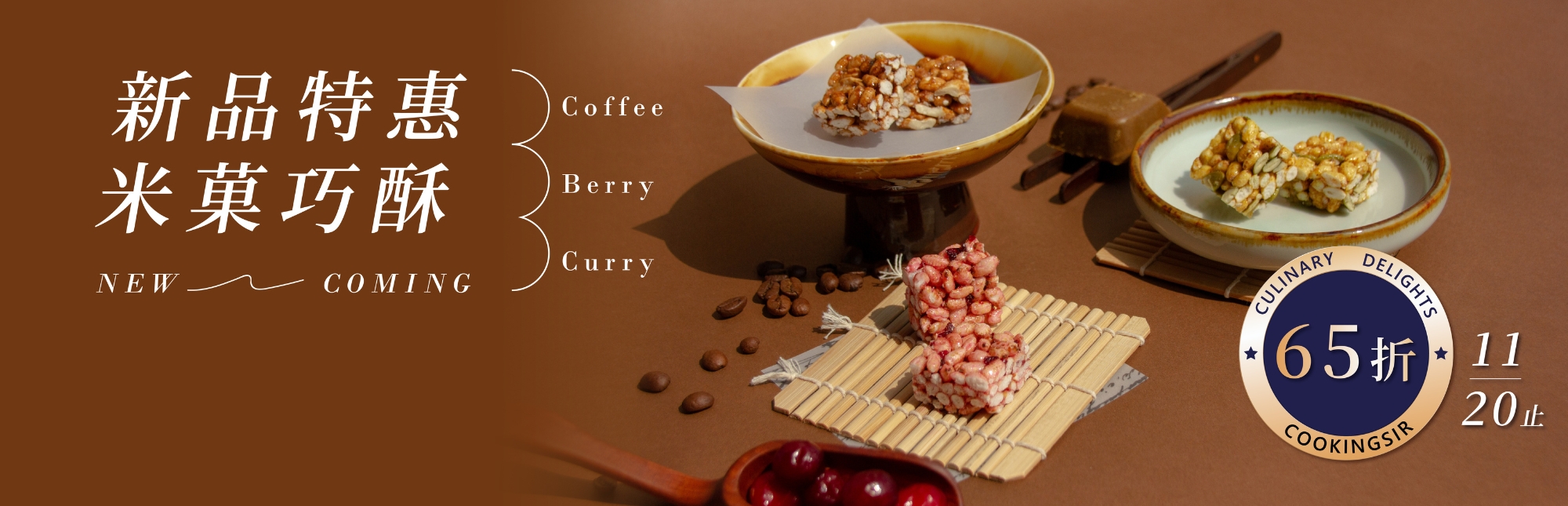 慶祝男煮人點心室三週年,全新「米菓巧酥」系列同步上市!以台灣糙米為底,結合手作工藝與三款獨家風味——咖啡、野莓、咖喱,打造外酥內鬆的幸福滋味。