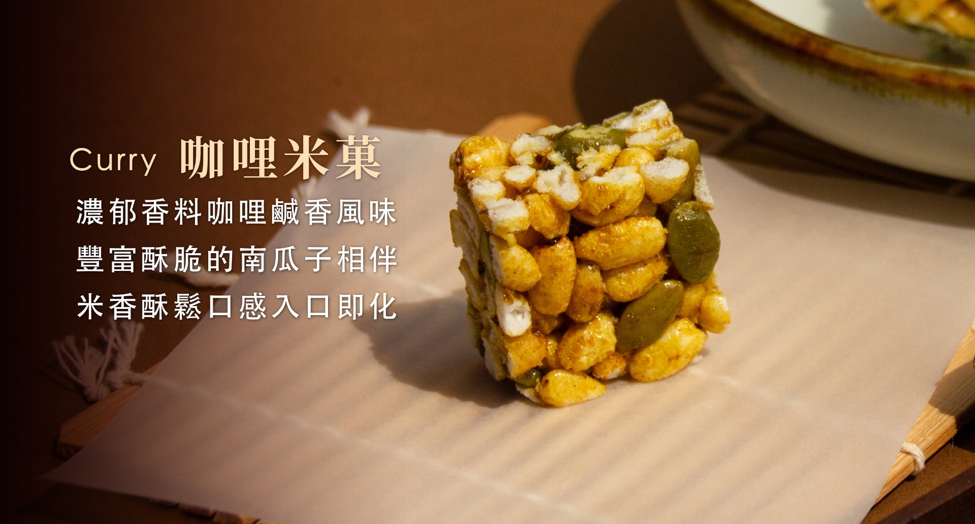 米菓巧酥系列以米香為底,融合咖啡、野莓、咖喱三款靈感,
