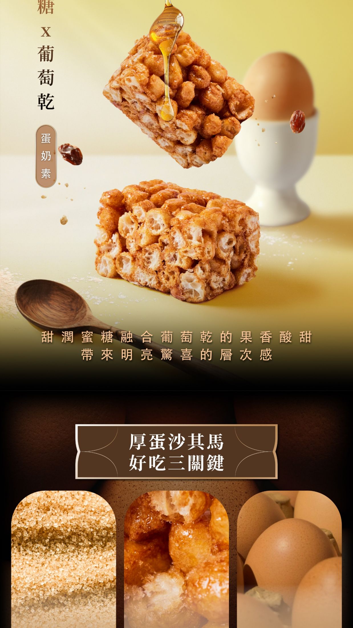酥、鬆、軟、香、甜,是本店「厚蛋沙其馬」的標準風味,秘訣在於高比例的用蛋量,這就是拆封隨即香氣四溢且唇齒留香的關鍵,「厚蛋蜜糖沙其馬」精選上糖與紫提,一口即饗酥香酸甜的美妙滋味,是甜點控的必吃好食。