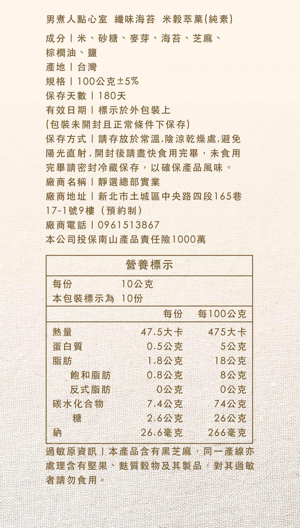 以台灣備受讚揚的蓬萊白米為基底,融合海味膳纖海苔與頂規黑芝麻,香脆過癮、清爽鹹香、營養可口,最適合家庭共饗、辦公解饞、旅行補給,午茶時間搭配飲品,就是最愜意的紓壓時光。純淨無負擔・不粘牙配方,職人純手工,搭配精緻袋裝設計,單入獨立包裝好衛生,精巧便攜,送禮自用兩相宜,台灣嚴謹製造,無添加防腐劑,安心又美味,一吃就愛上!